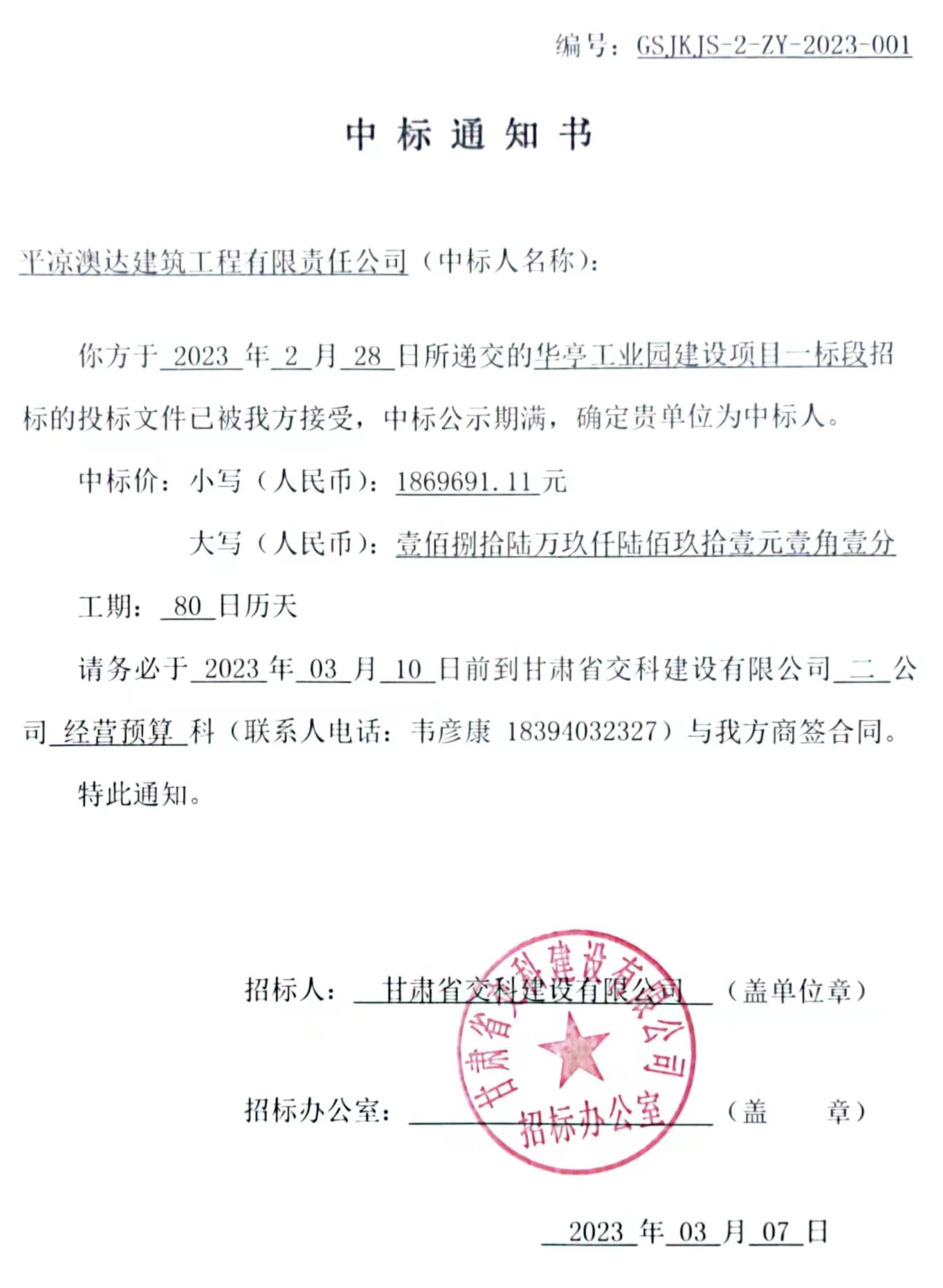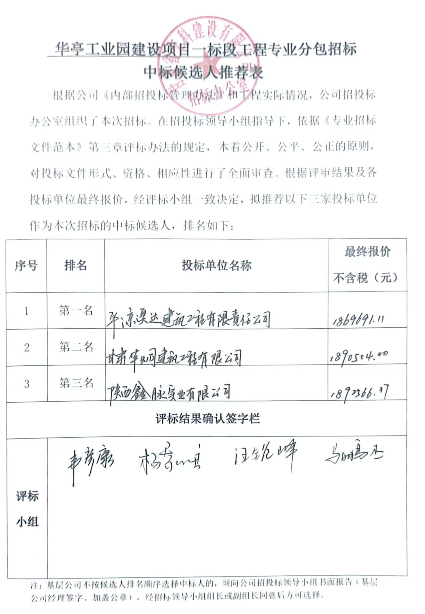 华亭工业园建设项目一标段中标候选人及中标通知书