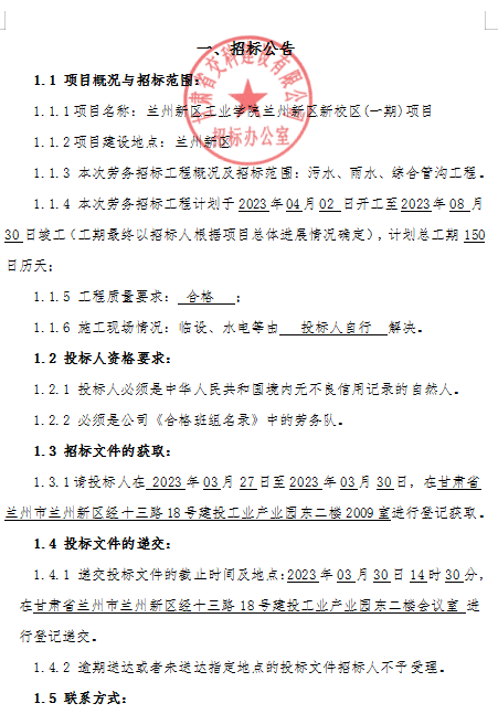 兰州新区工业学院兰州新区新校区(一期)项目招标公告