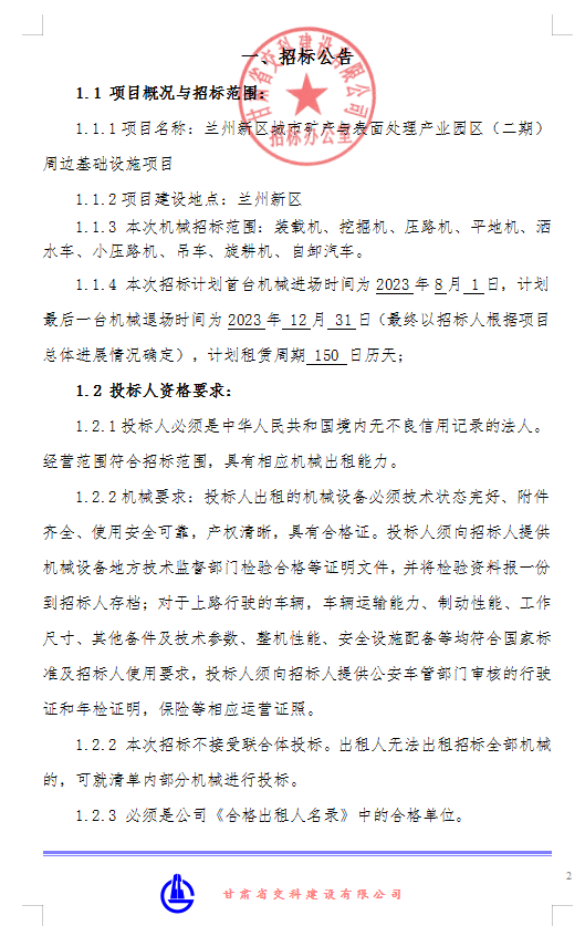 兰州新区城市矿产与表面处理产业园区 (二期)周边基础设施项目-机械租赁招标公告