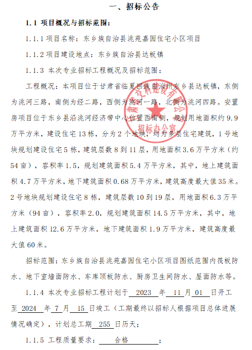 <h3>东乡族自治县洮苑嘉园住宅小区项目专业分包招标公告</h3>
