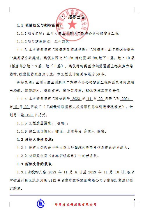 <h3>兰州大宏兰州新区二期综合办公楼 建设工程劳务分包-招标公告</h3>