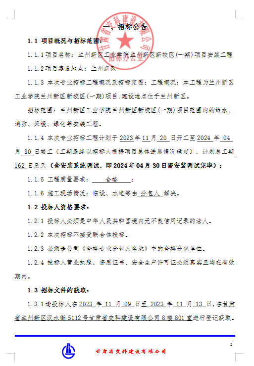 <h3>兰州新区工业学院兰州新区新校区 (一期)项目安装工程-专业分包招标公告</h3>