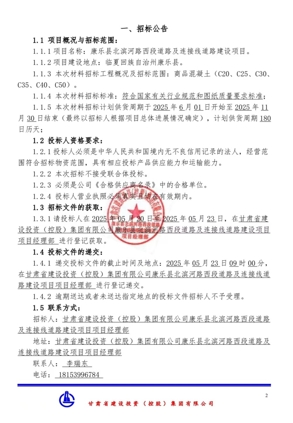 康乐县北滨河路西段道路及连接线道路建设项目-商品混凝土-招标公告