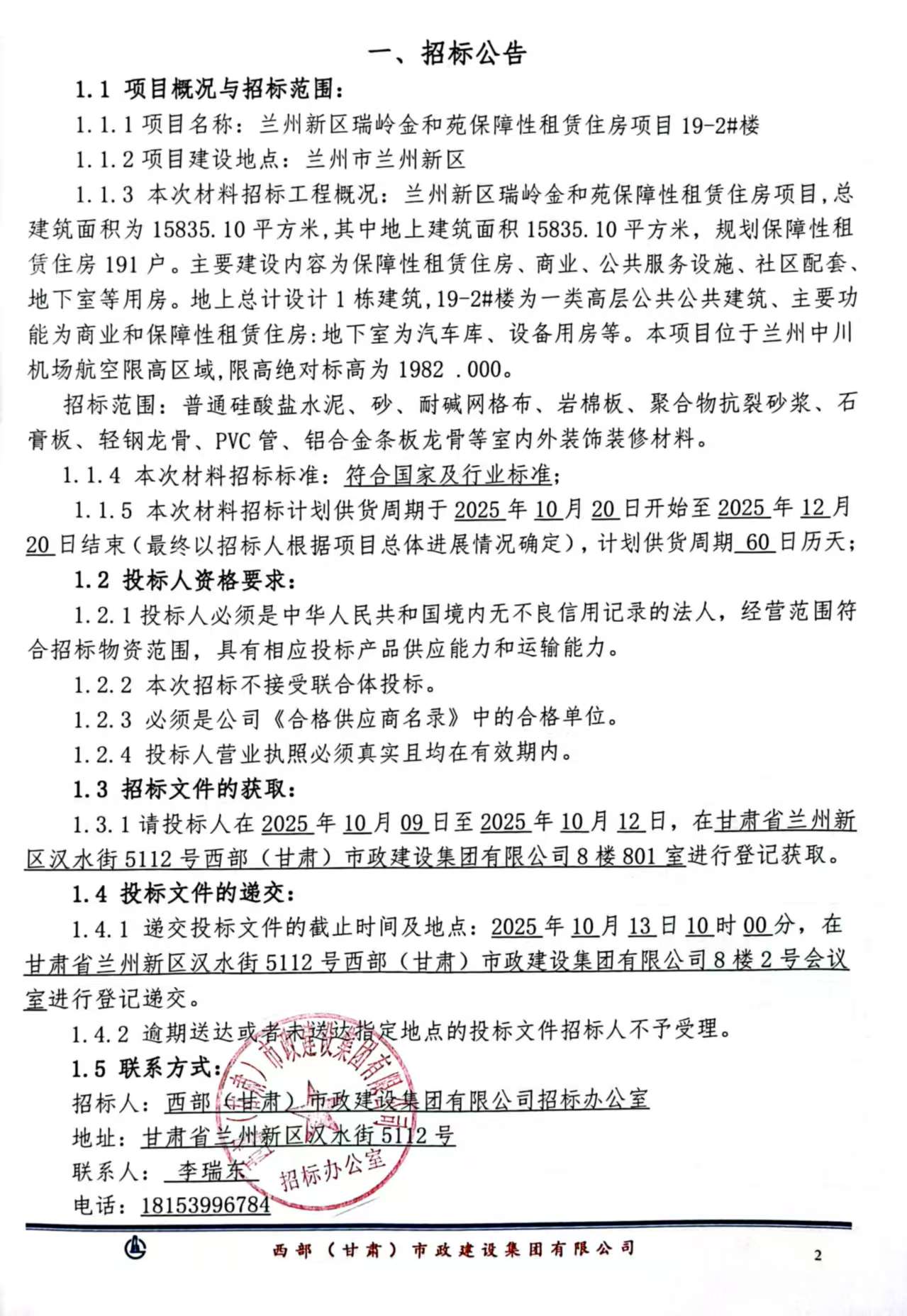 兰州新区瑞岭金和苑保障性租赁住房项目19-2#楼-室内外装饰装修材料-招标公告