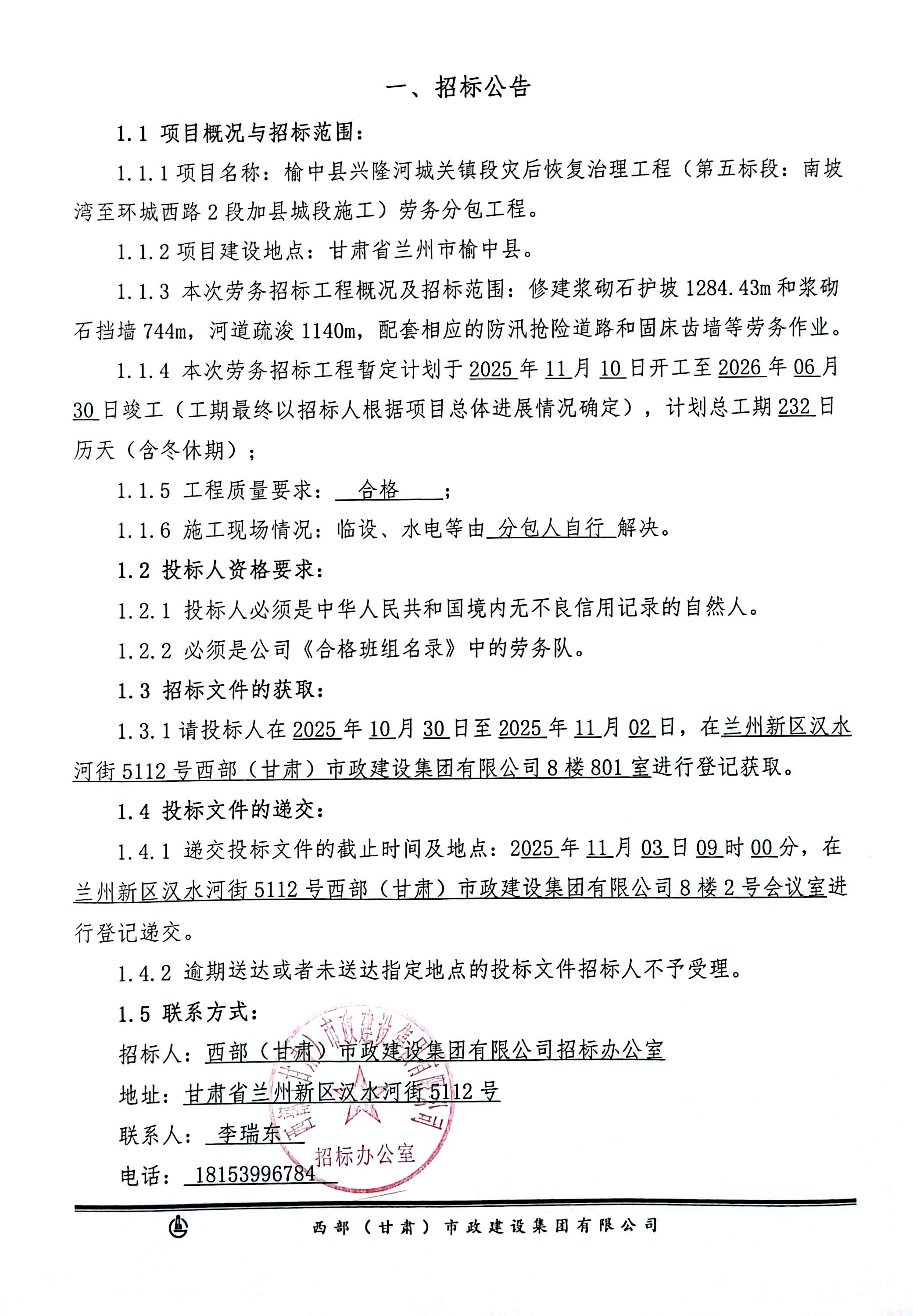 榆中县兴隆河城关镇段灾后恢复治理工程(第五标段:南坡湾至环城西路2段加县城段施工)劳务分包工程-招标公告