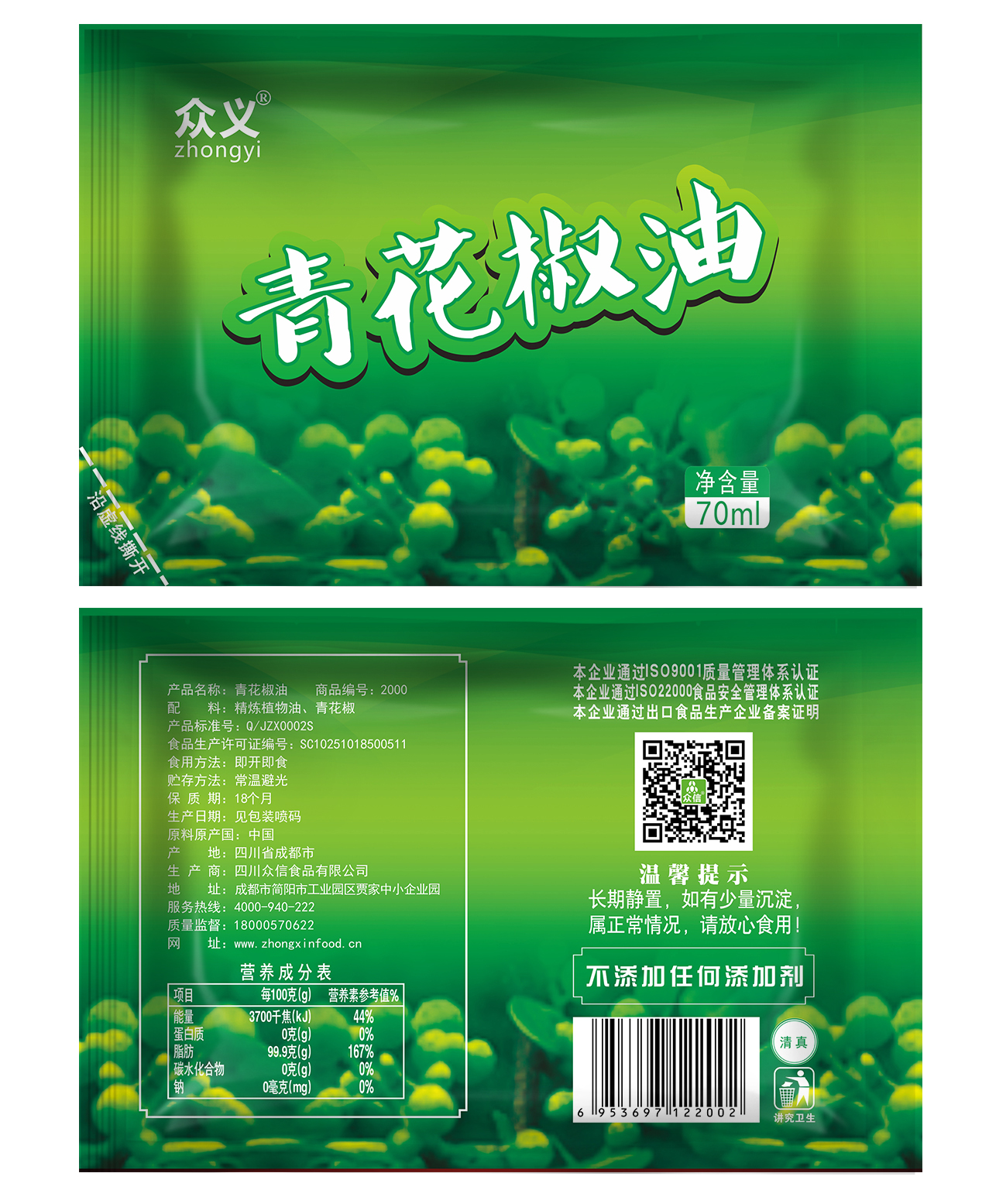 【品名】:2000众义70ml袋装青花椒油